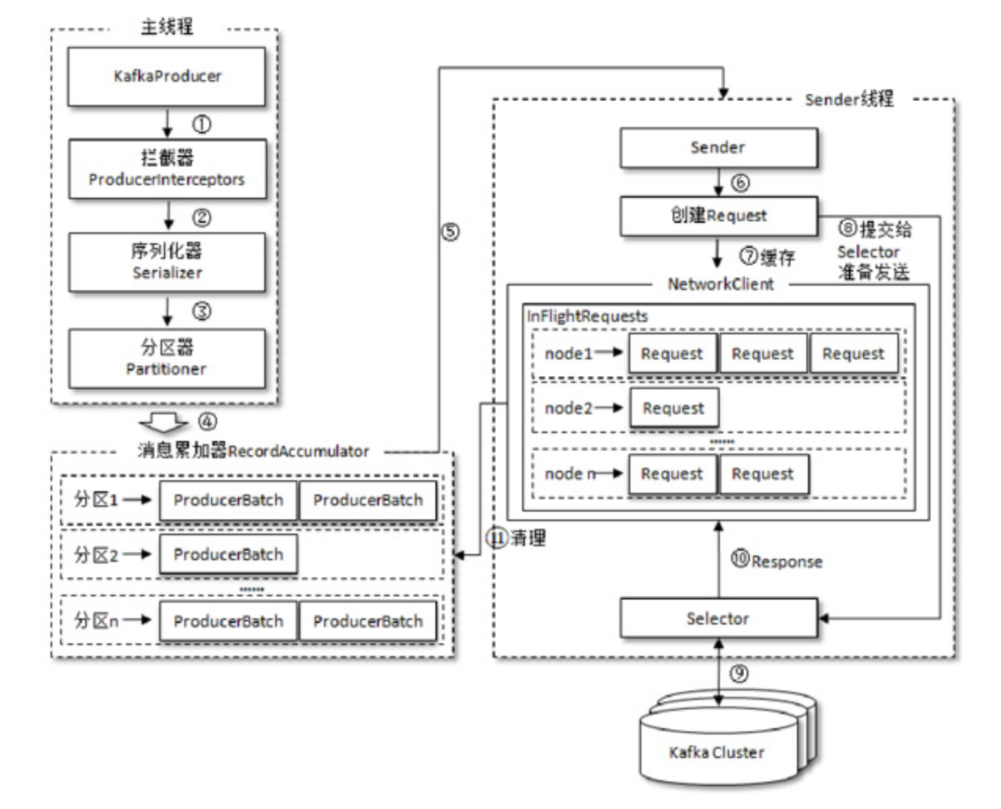 整个生产者客户端主要分为两个线程,主线程与发送线程。在主线程中由 KafkaProducer 创建消息,然后通过可能的拦截器、序列化器和分区器的作用之后缓存到消息累加(RecordAccumulator,也称为消息收集器)中。Sender 线程负责从 RecordAccumulator 中获取消息并将其发送到 Kafka 中。